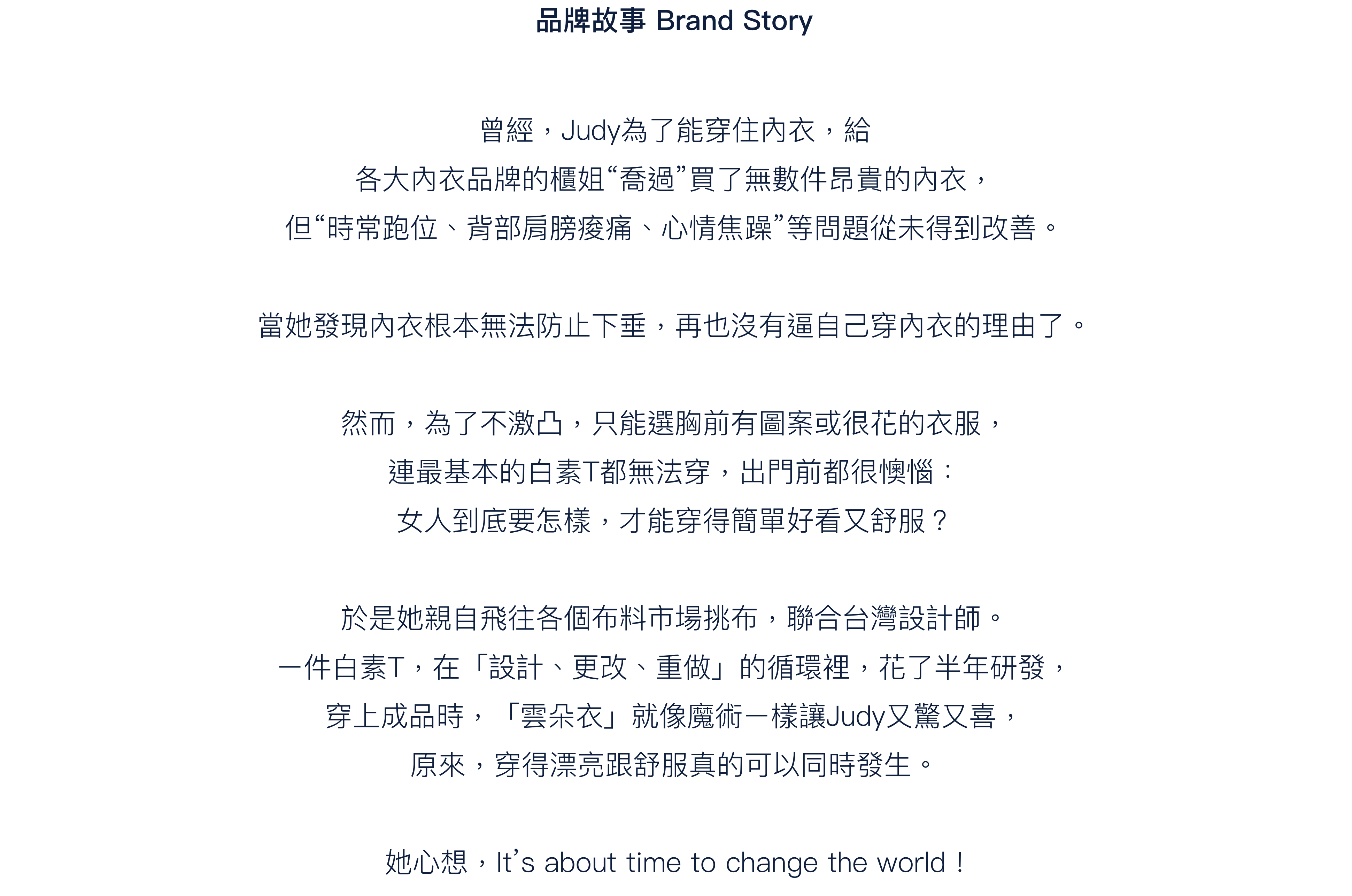 於2020年成立,專做「+胸墊」服裝, 以女性賦能為出發點的慢時尚品牌。  從產品開發到包裝堅持以環保為核心訴求, 用最好的布料,做質感舒適、耐看耐久的「雲朵衣」, 讓你不穿內衣 也能安心、從容的出門。