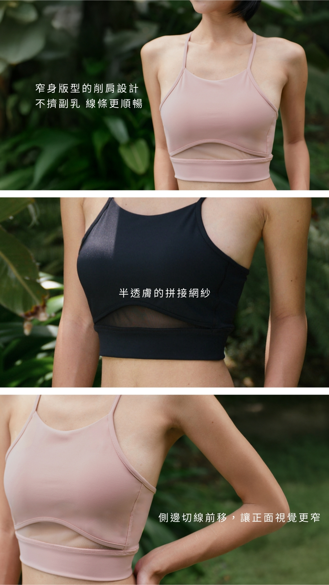 ・窄身版型的削肩設計,不擠副乳線條更順暢