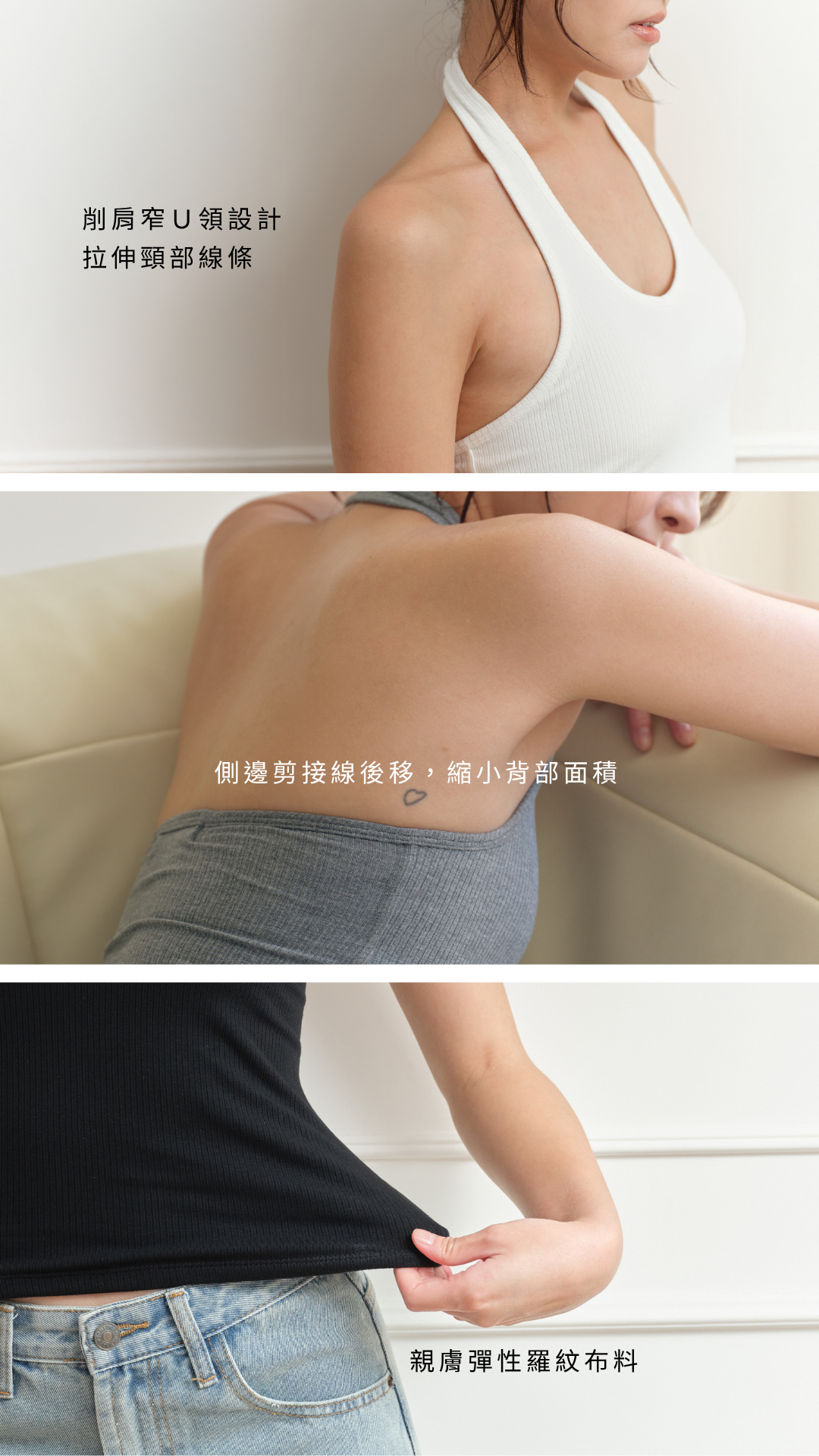 • 削肩窄U領設計,拉伸頸部線條