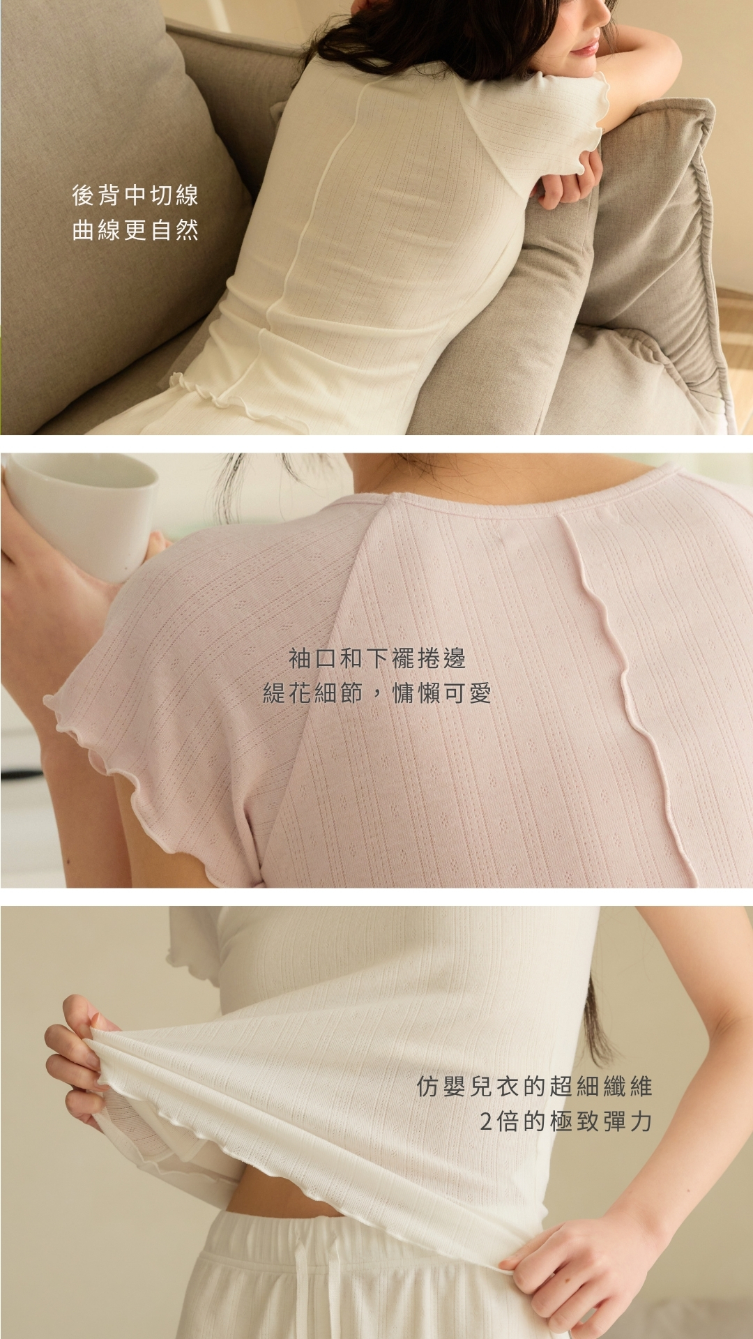 ➂ 慵懶可愛:袖口和下襬捲邊、緹花細節